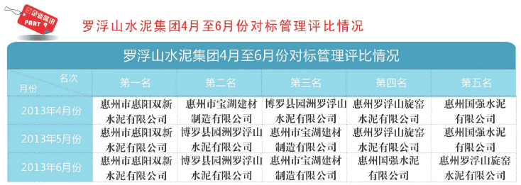 6月22日上午、6月25日至26日, 羅浮山水泥集團常務副總戰兼財務總監謝偉松、集團辦公室主任李麗華、集團質監中心主任曾崽平與集團下屬各廠抽派的總經理(或副總經理),財務抖長、車間主任、供銷科長、化驗室主任、行政科(組)長分別組成財務考核小組、生產考核小組、供銷考核小組、化驗室考核小組、行政考核小組,對各廠的對標管理工作進行檢查考核。羅浮山水泥集團董事長兼總哉吳國強參加了最后的檢查總結匯總會。為了使8S管理活動得到扎實有效的推行.完善公司的行政管理制度,集團公司決定: 從2013年第二季度對標管理檢查開始增設行政考核小組,將行政工作指標(含88管理)納入對標管理季度考核當中。
